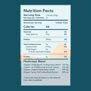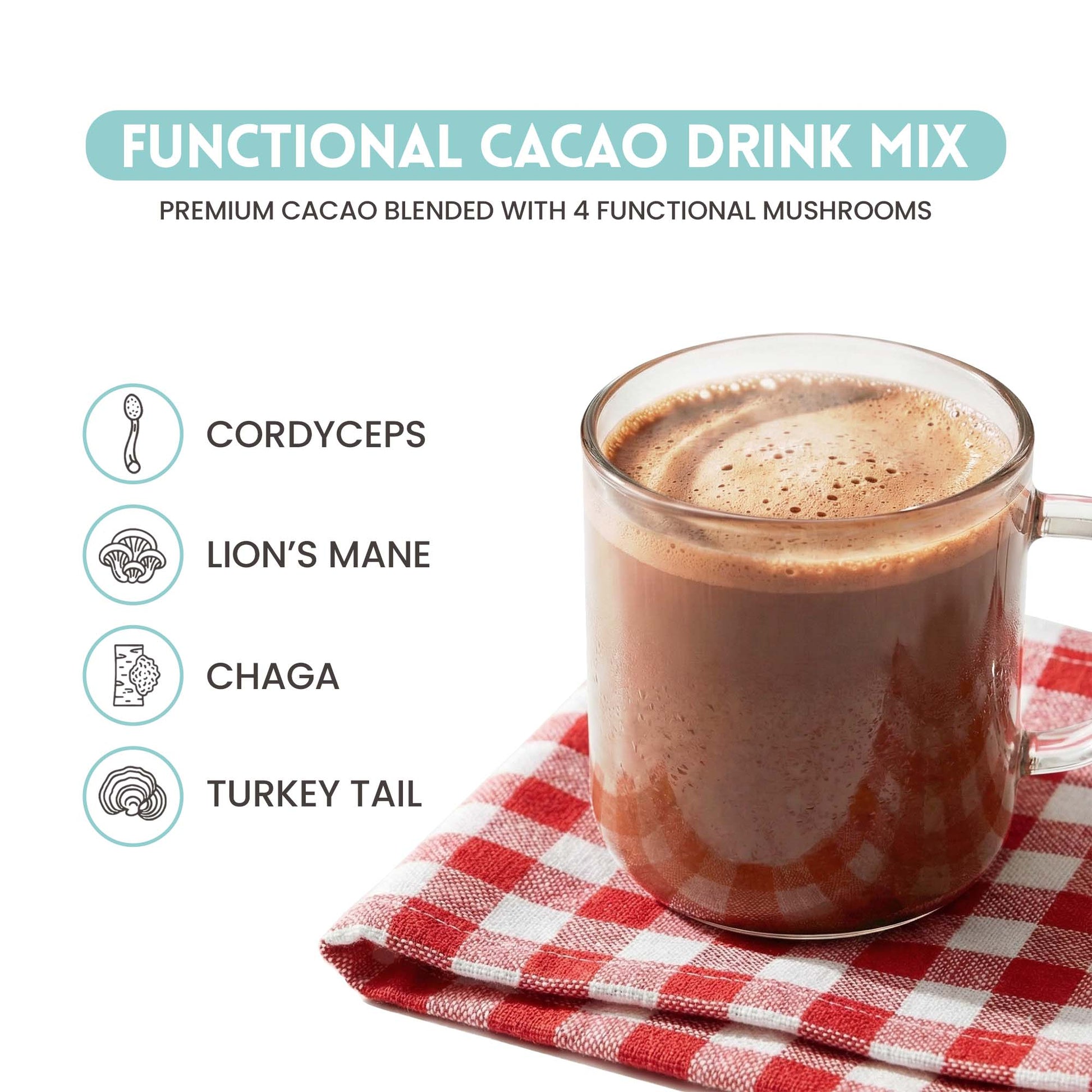 Ingredients: *Cacao, *Oat Milk (Oats, Enzymes),*Coconut Milk (Coconut Milk, Tapioca Starch, Acacia Fiber), *Cordyceps Militaris Mushroom Extract, *Lion's Mane Mushroom Extract, *Chaga Mushroom Extract, *Turkey Tail Mushroom Extract,*Guarana Extract, *Monk Fruit, Himalayan Pink Salt