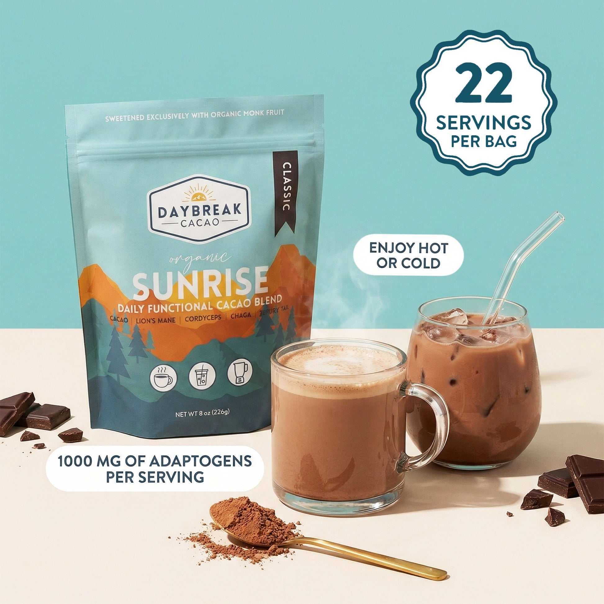 Our Classic Sunrise blend combines the creaminess of oat and coconut milk with rich Peruvian cacao to create a delicious and healthy chocolate drink.