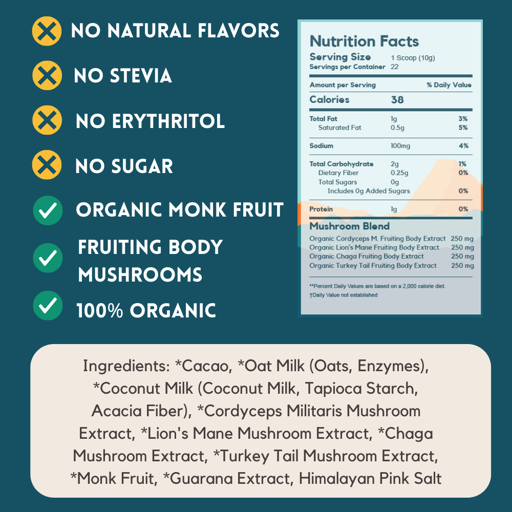 Ingredients: *Cacao, *Oat Milk (Oats, Enzymes),*Coconut Milk (Coconut Milk, Tapioca Starch, Acacia Fiber), *Cordyceps Militaris Mushroom Extract, *Lion's Mane Mushroom Extract, *Chaga Mushroom Extract, *Turkey Tail Mushroom Extract,*Guarana Extract, *Monk Fruit, Himalayan Pink Salt